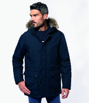 65% polyester/35% cotton canvas with PU coating. Polyester padding and lining. Contrast lined padded hood with detachable faux fur trim. Full length zip with inner zip guard and studded storm flap. Two chest pockets with stud closure. Inner tear release pocket. Adjustable drawcord waist. Two front pockets with stud closure. Ribbed storm cuffs. Zip access for decoration.