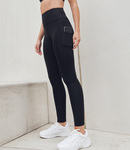 86% polyester/14% elastane interlock. Squat-proof. High waisted with deep waistband. Media pocket on left side panel. Tear out label.