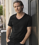 100% organic combed ringspun cotton. Enzyme washed. Double pre-shrunk. Tailored fit. Ribbed V neck. Taped neck and shoulders. Side seams. Twin needle stitching.