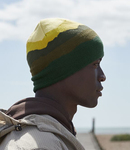 95% recycled polyester/4% nylon/1% elastane. Double layer knit. Pull on style. Bold mountain scape design. Tear out label.