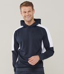 Brushed back fleece. Drop shoulder style. Three panel hood. Crossover neck detail. Contrast shoulder, upperarm and side panels (black and navy are self colour). Two front zip pockets. Ribbed cuffs and hem. Tear out label.