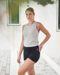 High waisted, No CF seam, Self fabric elasticated waistband, Twin needle stitching at hem, All over stretch, Side seams, Side pocket, Tear out label