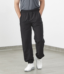 Mesh lining with polyester satin lower leg lining. Showerproof and windproof. Elasticated waistband with inner drawcord. Two side pockets right with zip. Rear pocket with tear release closure. Elasticated leg ends with ankle zips.