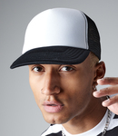 Polyester mesh rear panels. 5 panel. Padded front panel and peak. Retro style snapback size adjuster.