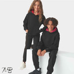Drop shoulder style. Brushed back fleece. Double fabric hood with contrast inner. No drawcords to comply with EU regulations. Front pouch pocket. Ribbed cuffs and hem.